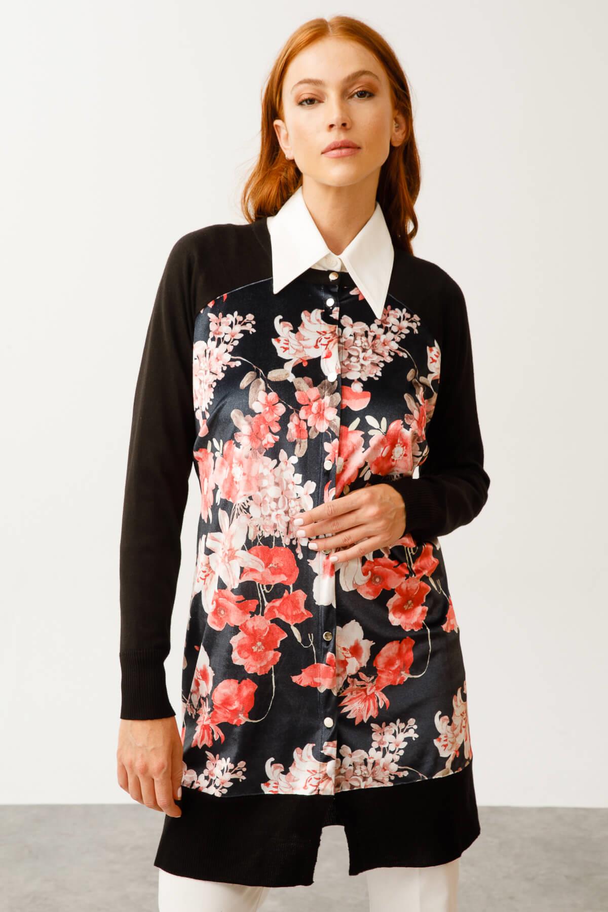 Mutlu Ertan Kadın Çiçek Desenli Triko Kombinli Hırka Siyah-Pembe 2958 (2958)