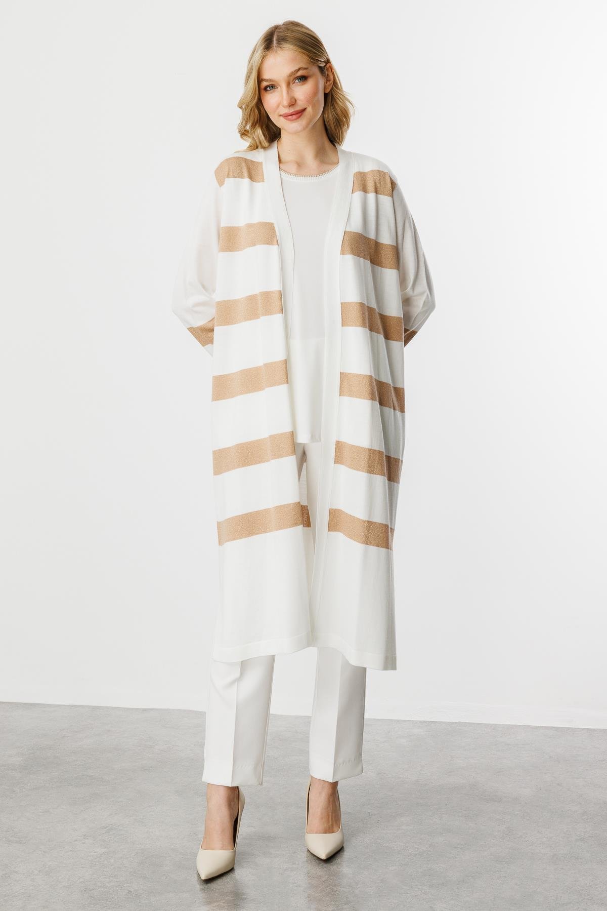 Mutlu Ertan Kadın Çizgili Uzun Yazlık Triko Hırka Ekru - Gold 20116 (20116)