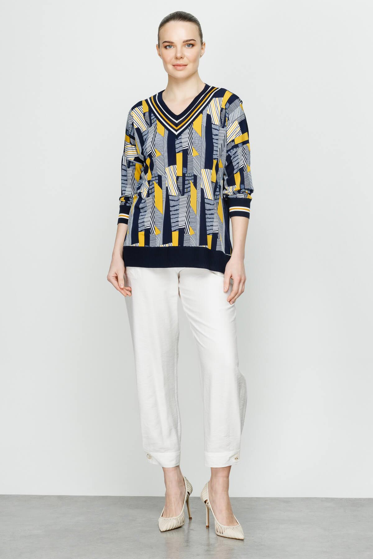 Mutlu Ertan Kadın Önü Desenli Arkası Triko Kombinli Truvakar Kol Bluz Lacivert - Sarı 20018