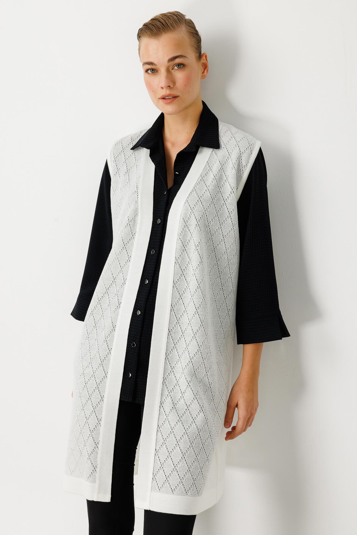 Mutlu Ertan Kadın Baklava Desen Ajurlu Triko Uzun Yelek Ekru 20110 (20110)