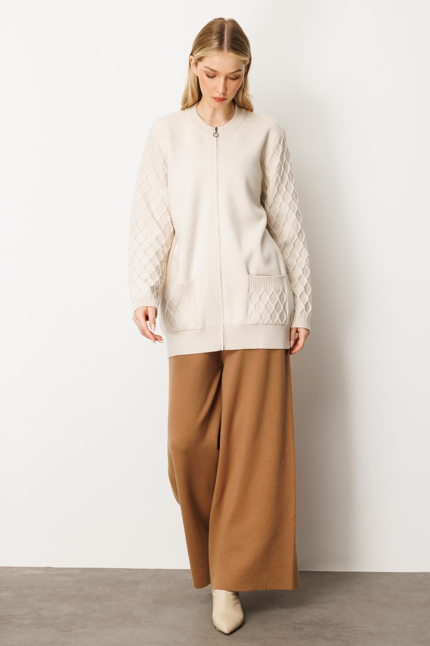 Mutlu Ertan Kadın Cep ve Kol Desenli Triko Hırka (25KSL4170) Taş 20239 (20239)