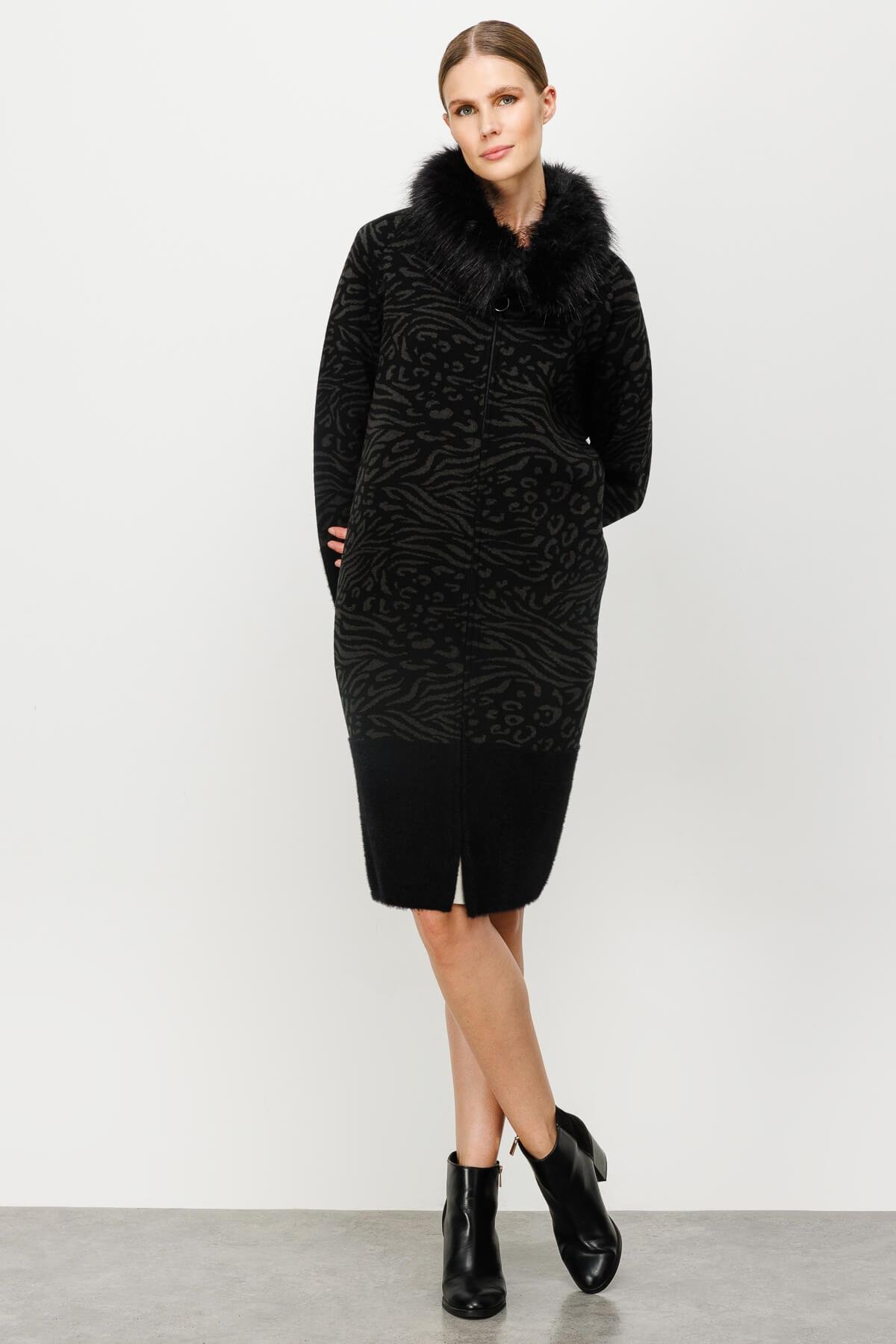Mutlu Ertan Kadın Desenli Kürk Yaka Detaylı Triko Hırka Siyah-Füme 20041 (20041)