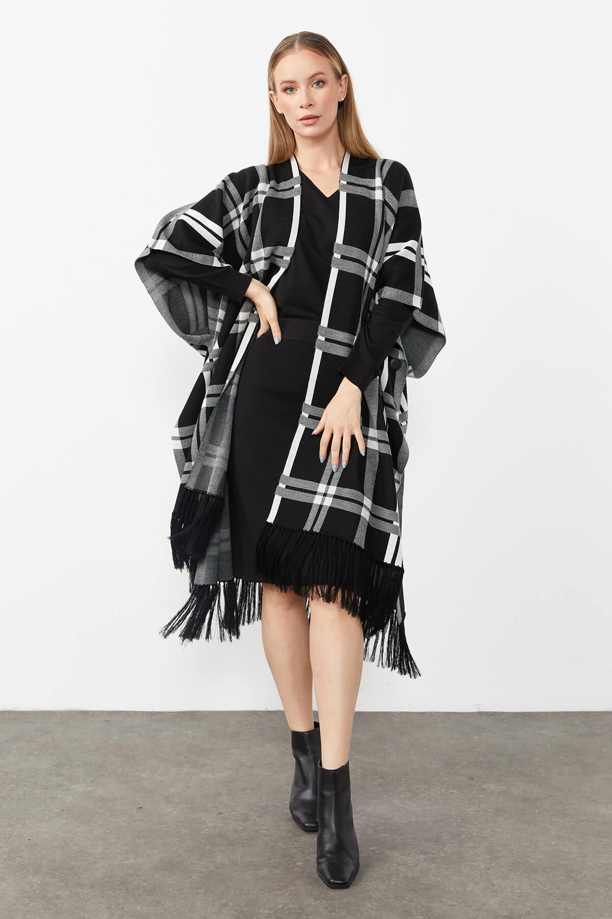 Mutlu Ertan Kadın Ekose Desenli Triko Panço Şal Siyah-Ekru 20087