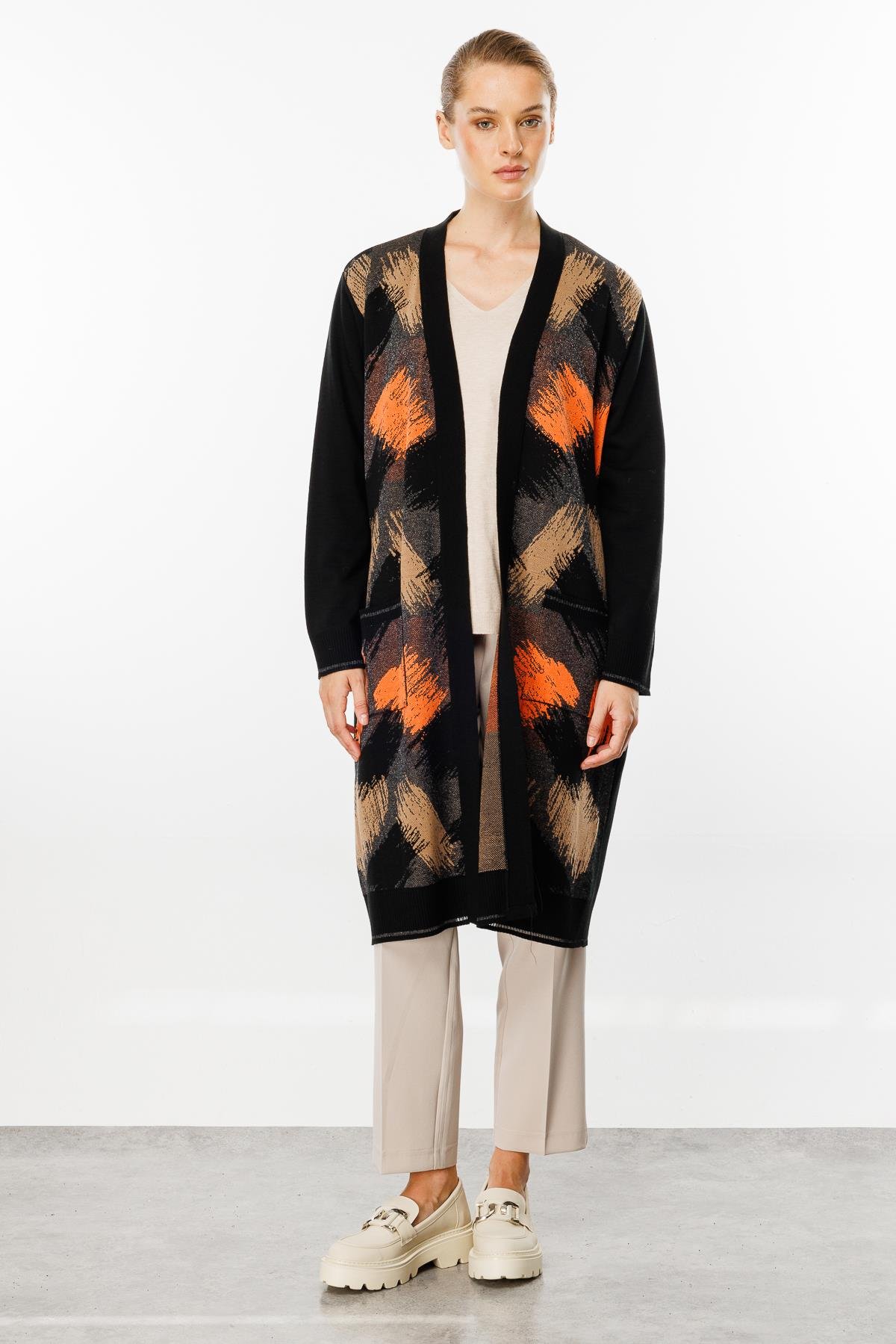 Mutlu Ertan Kadın Fırca Desen Triko Hırka Siyah-Mercan 20143