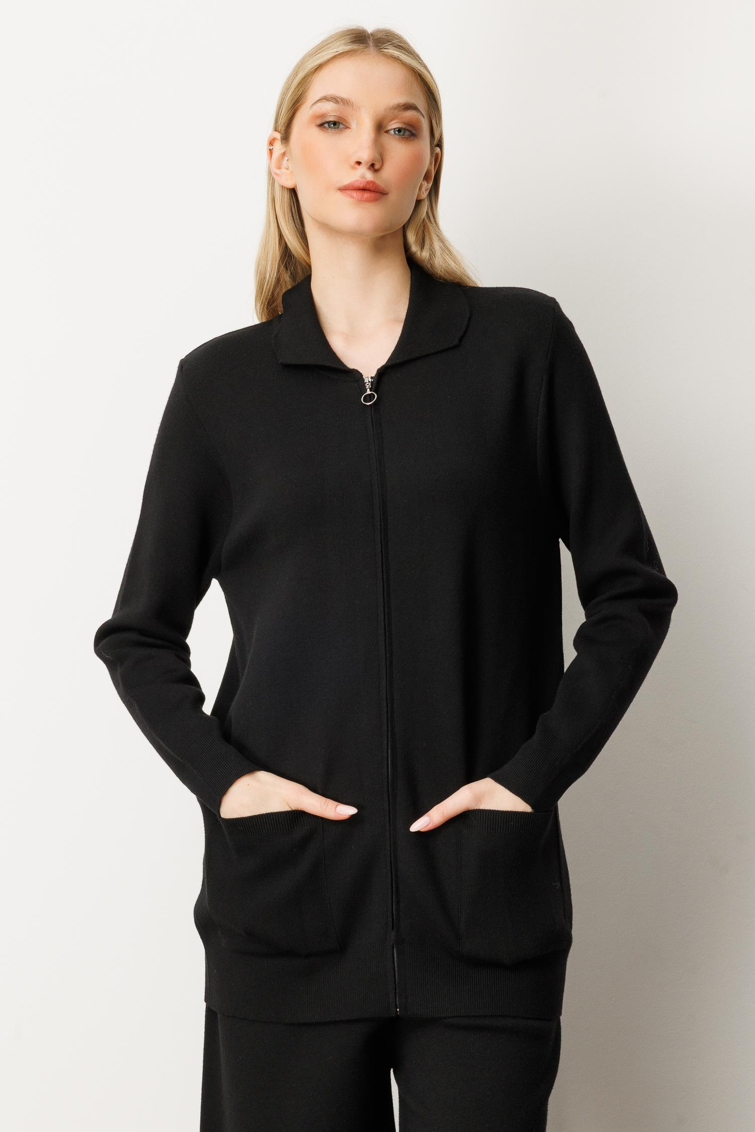 Mutlu Ertan Kadın Gömlek Yaka Fermuarlı Cep Detaylı Triko Hırka Siyah 20240