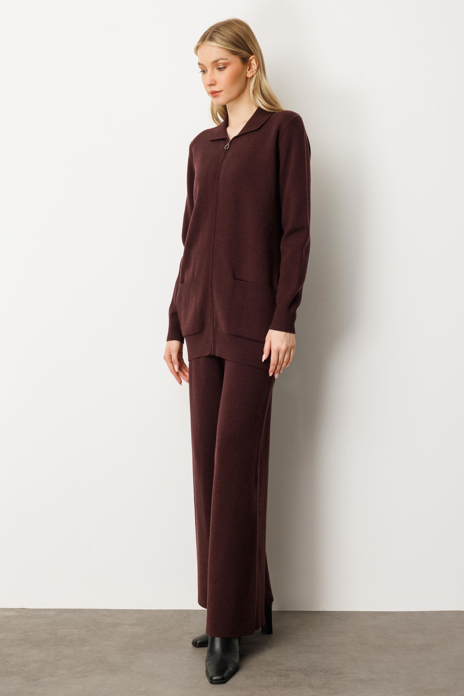 Mutlu Ertan Kadın Gömlek Yaka Fermuarlı Cep Detaylı Triko Hırka Vino 20240 (20240)