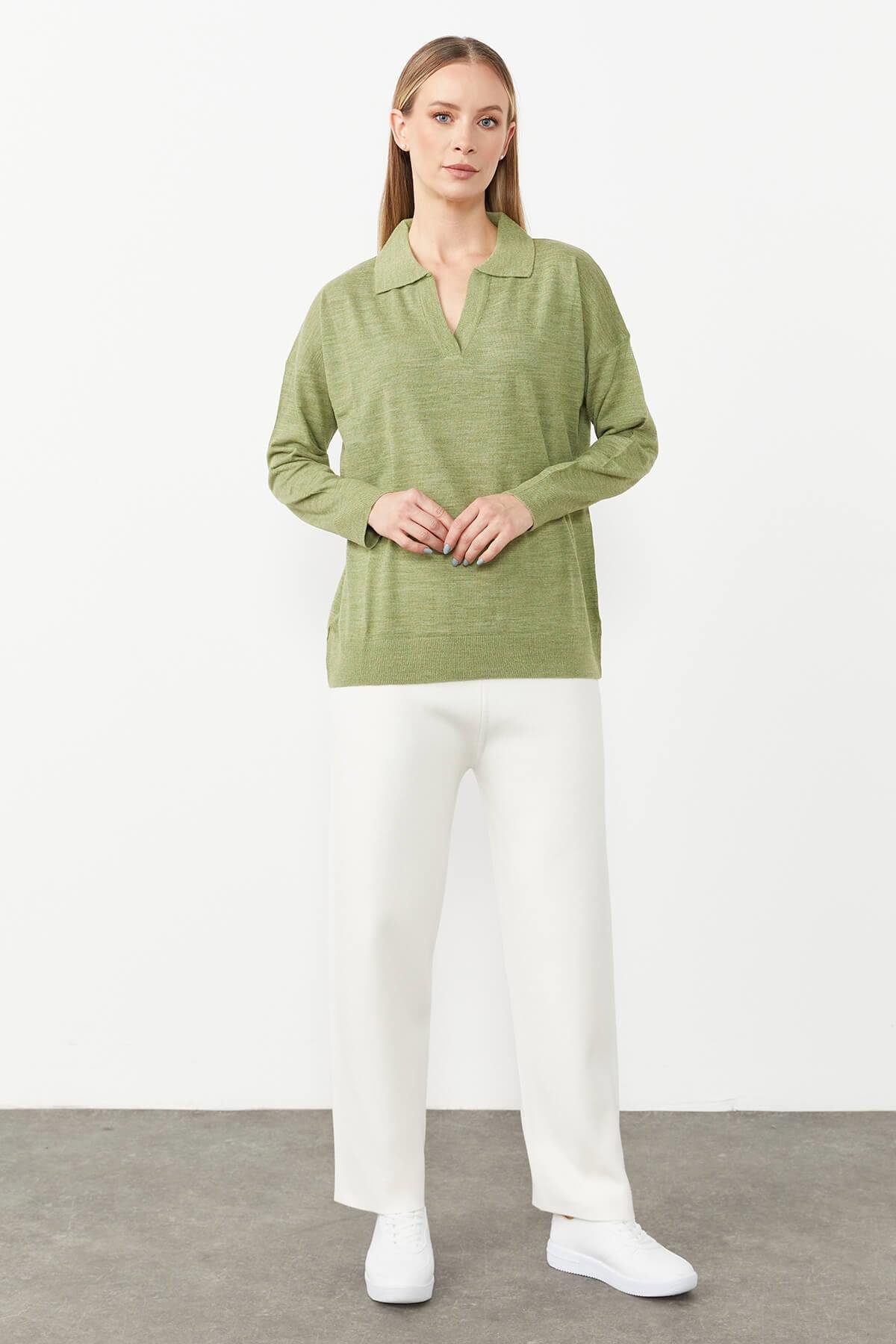 Mutlu Ertan Kadın Gömlek Yaka Triko Bluz Fıstık Yeşil 20086 (20086)