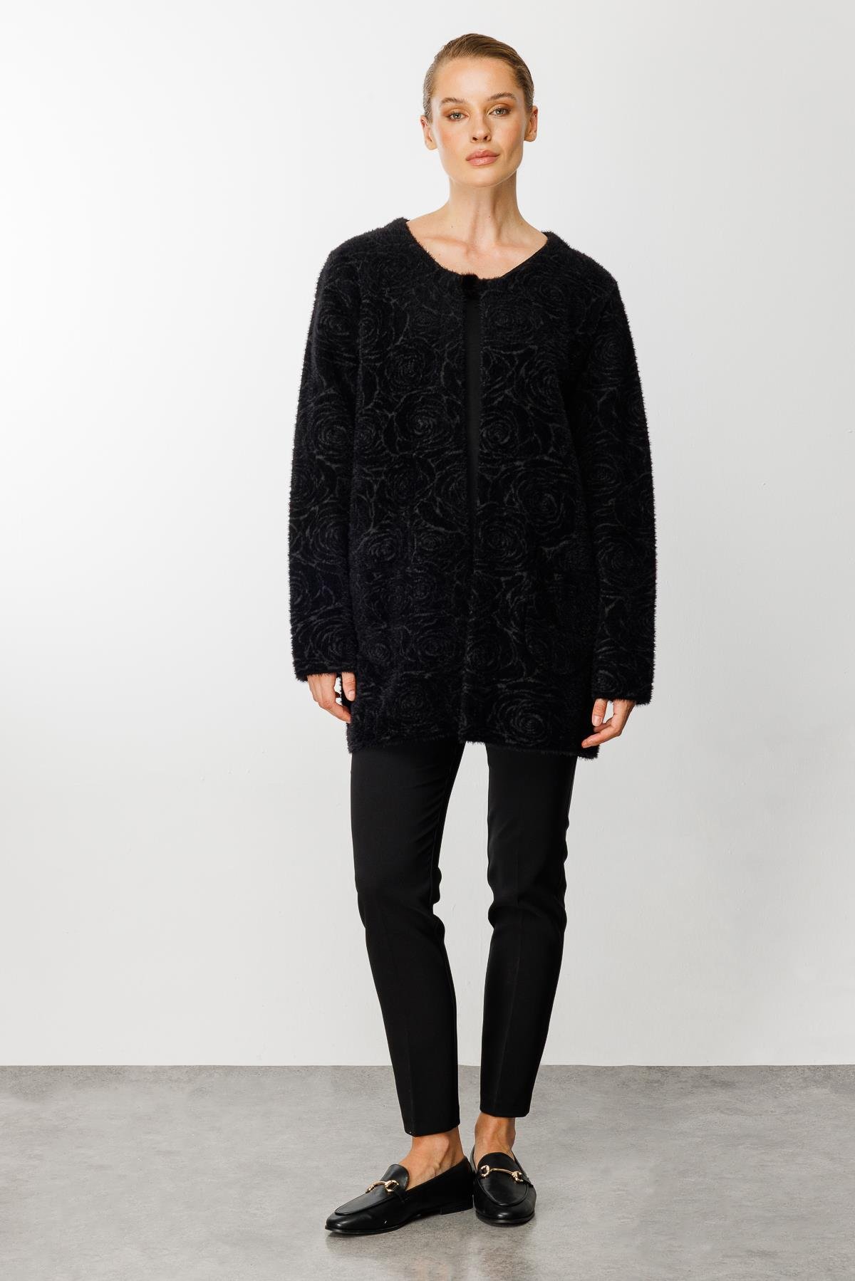 Mutlu Ertan Kadın Gül Desenli Angora Triko Cepli Hırka Siyah-Füme 2825 (2825)