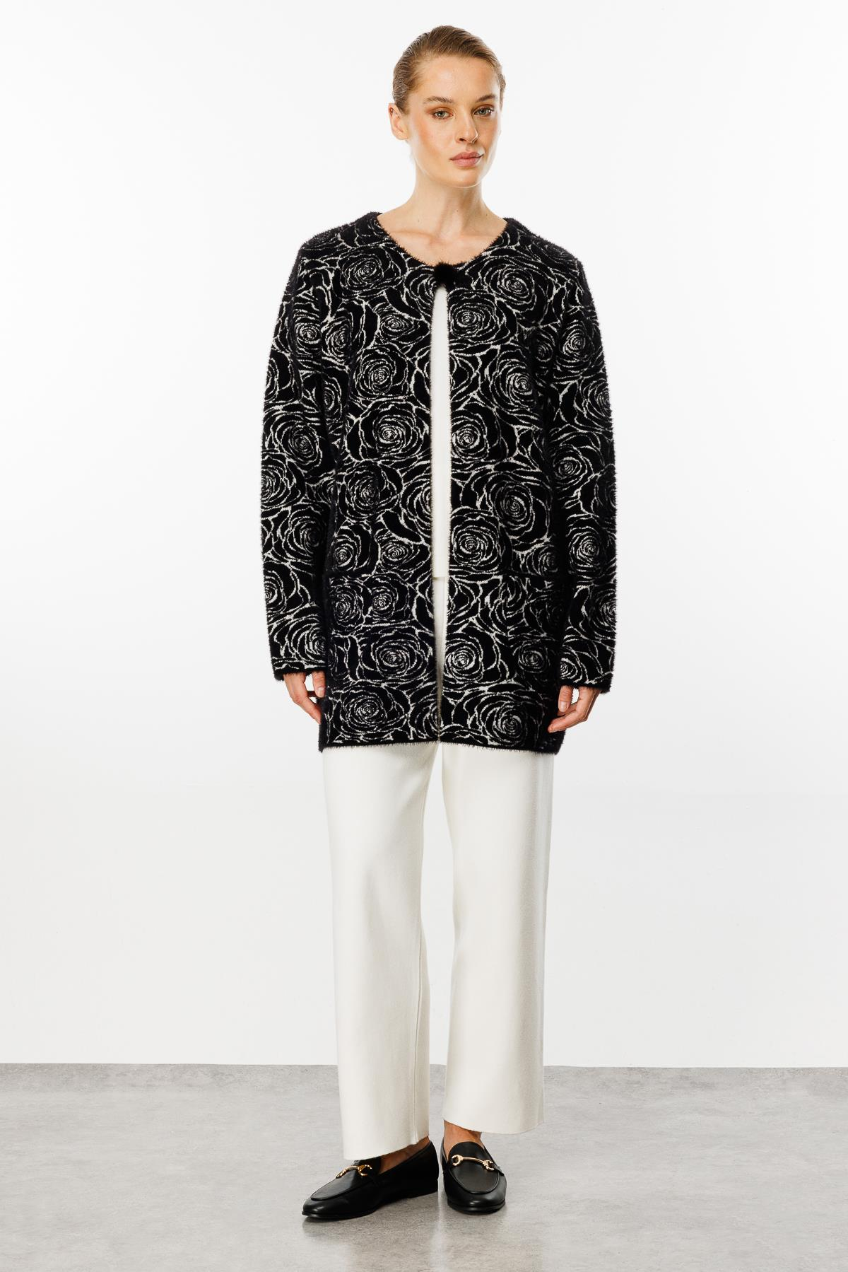 Mutlu Ertan Kadın Gül Desenli Angora Triko Cepli Hırka Siyah-Ekru 2825 (2825)