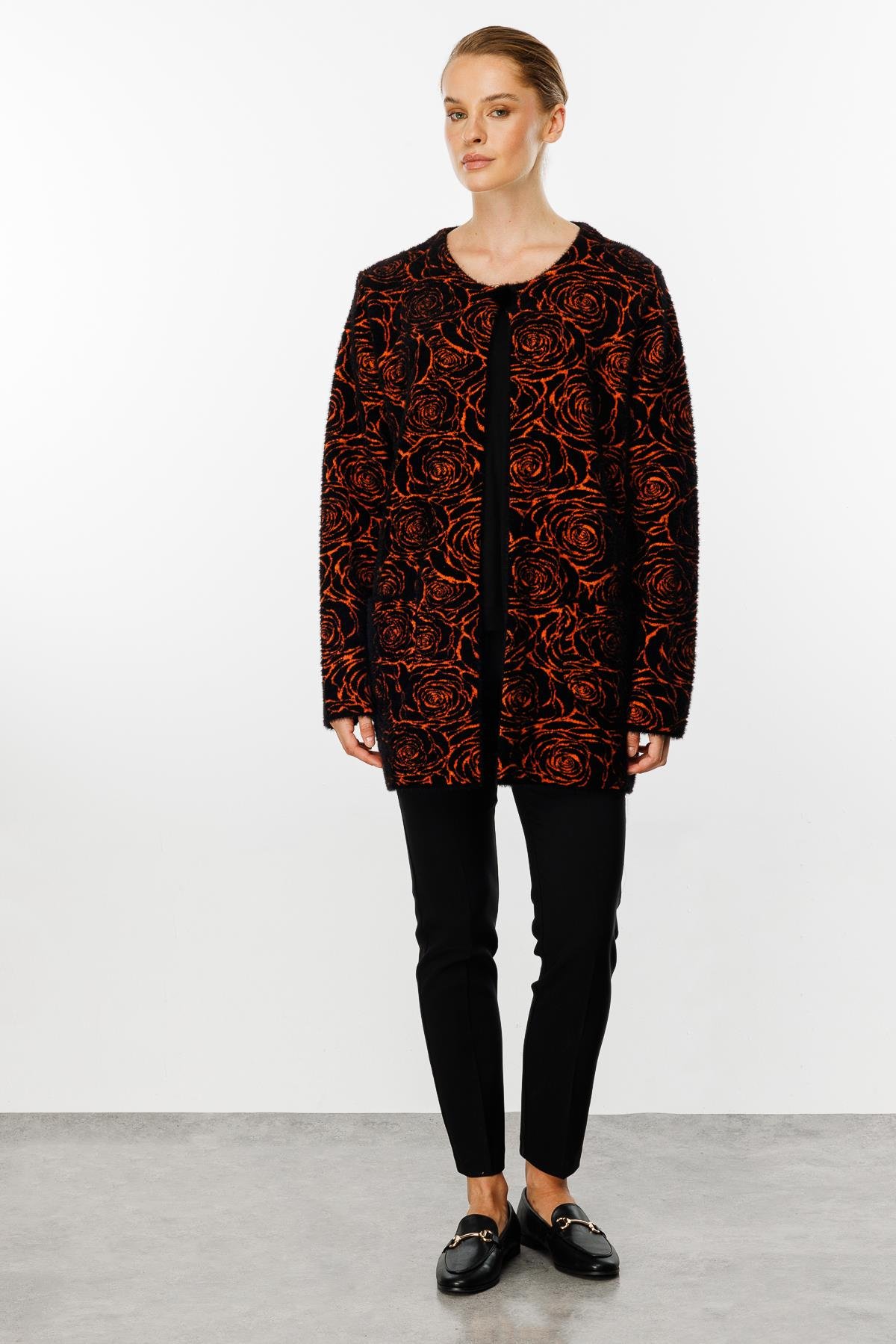 Mutlu Ertan Kadın Gül Desenli Angora Triko Cepli Hırka Siyah - Turuncu 2825