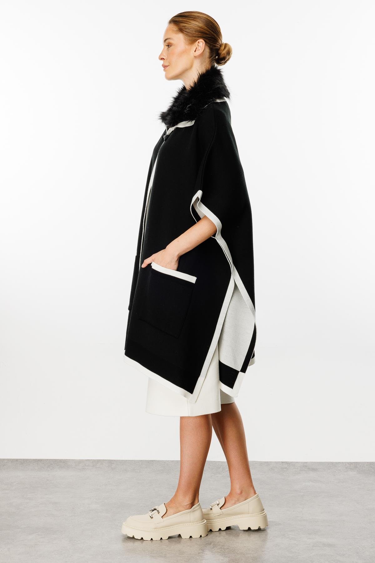 Mutlu Ertan Kadın Kürk Yaka Detaylı Triko Panço Şal Siyah-Ekru 20124 (20124)