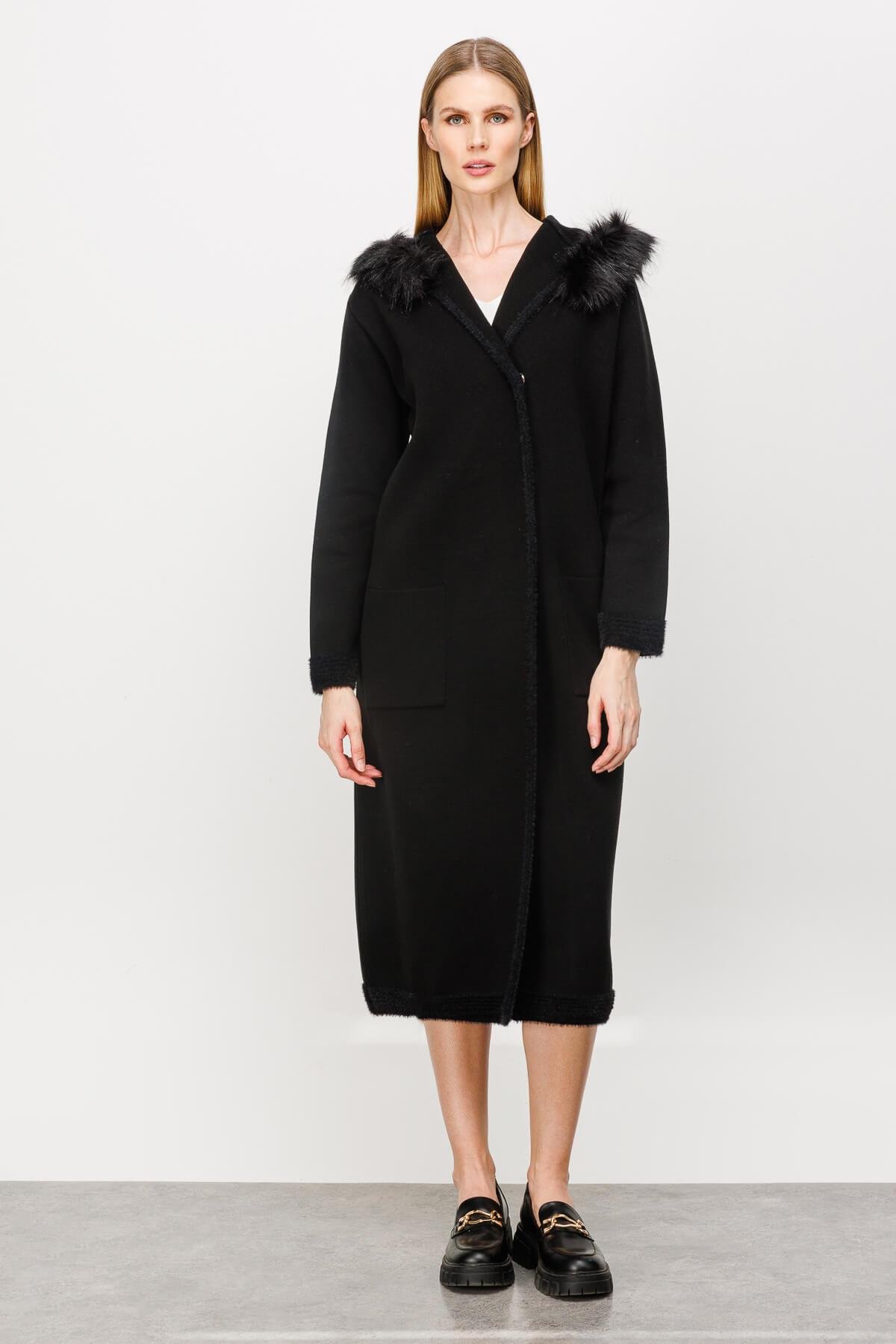 Mutlu Ertan Kadın Kapüşonlu Kruvaze Kapama Triko Pardesü Siyah 20052