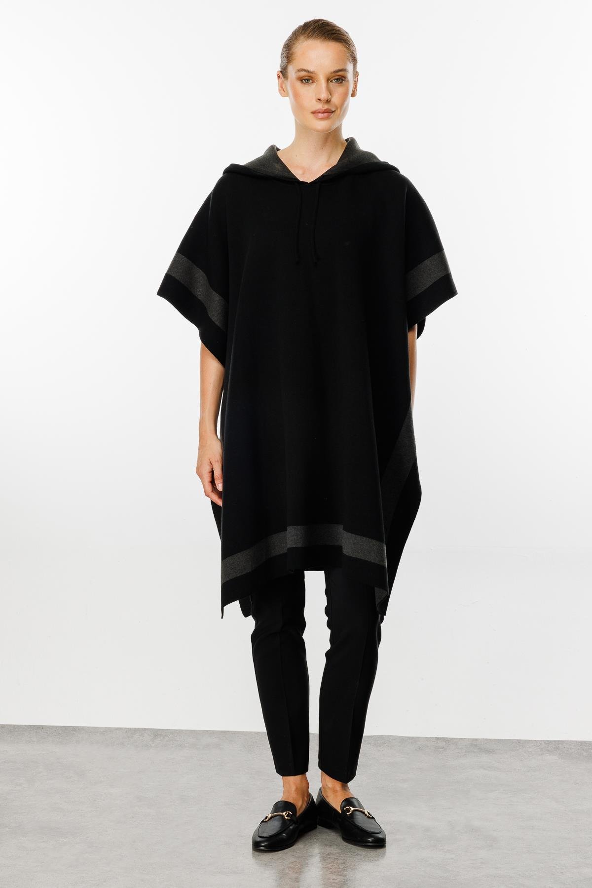 Mutlu Ertan Kadın Kapşonlu Triko Çizgili Panço Şal Siyah-Füme 20092