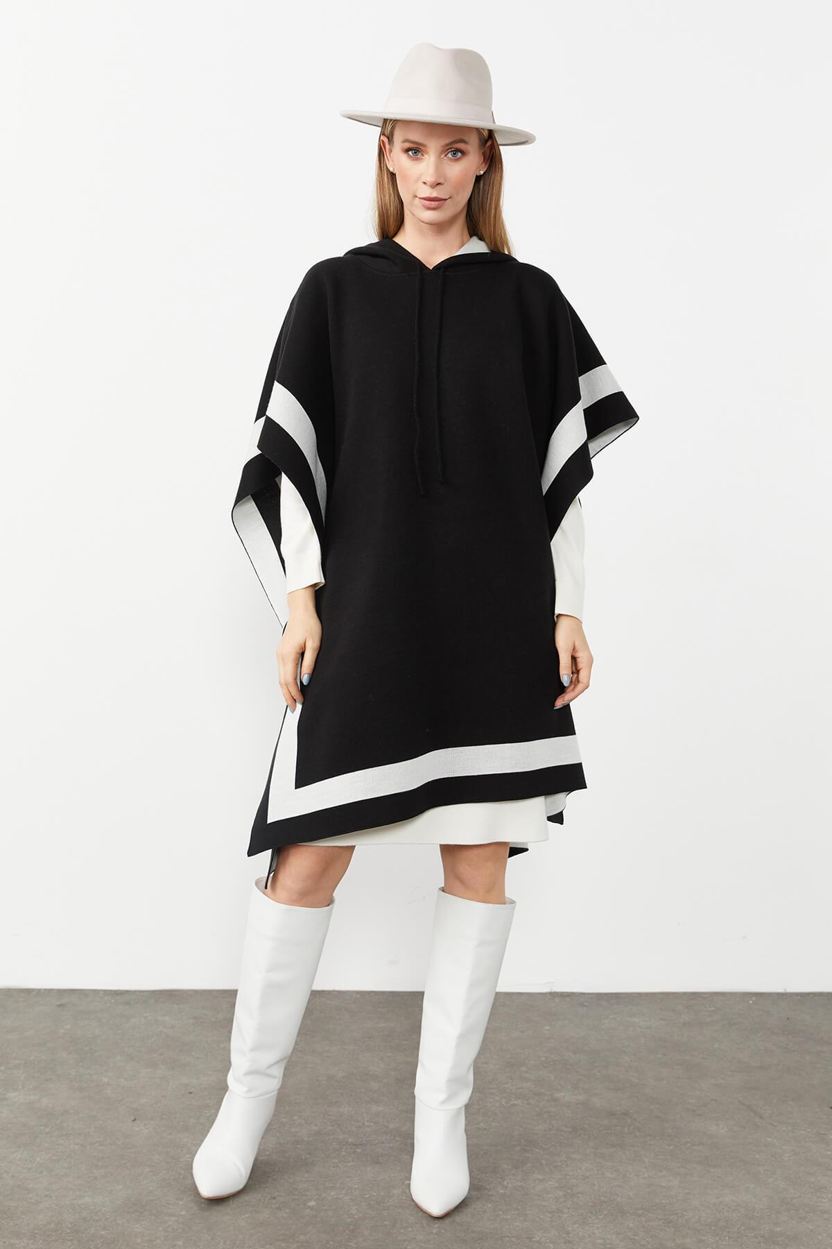 Mutlu Ertan Kadın Kapşonlu Triko Çizgili Panço Şal Siyah-Ekru 20092 (20092)