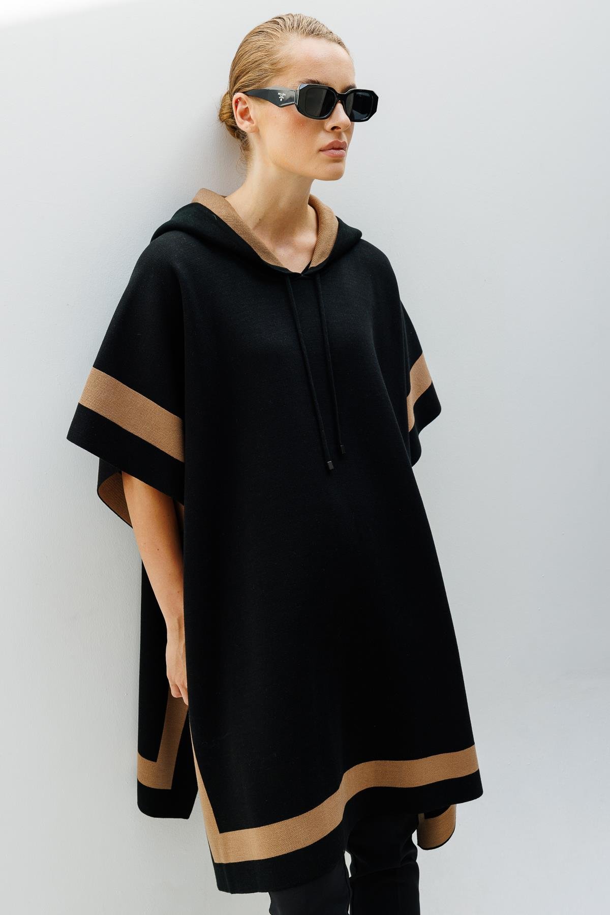 Mutlu Ertan Kadın Kapşonlu Triko Çizgili Panço Şal Siyah - Camel 20092 (20092)