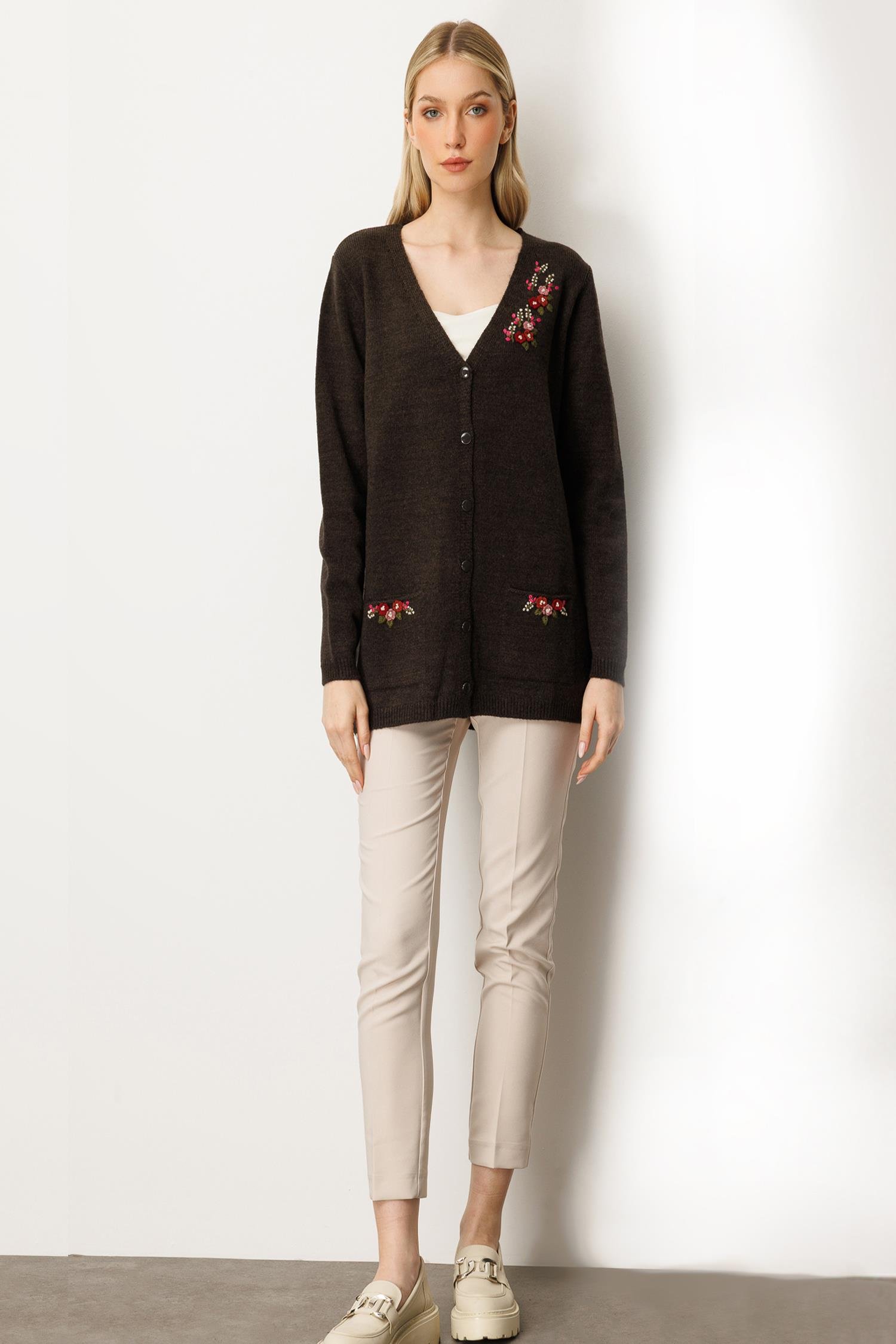 Mutlu Ertan Kadın Nakış Detaylı Triko Hırka Kahve 20221 (20221)