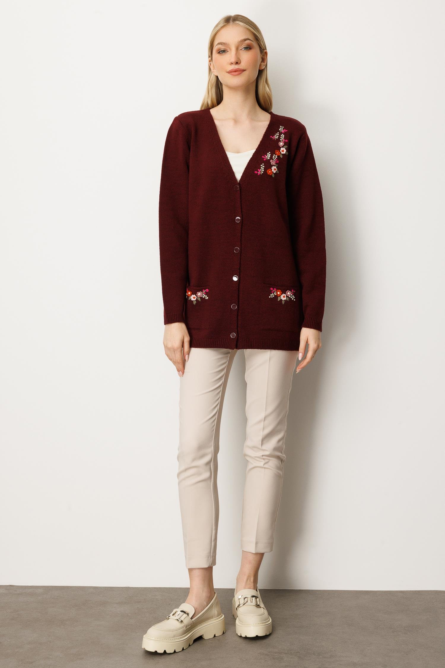 Mutlu Ertan Kadın Nakış Detaylı Triko Hırka Bordo 20221 (20221)
