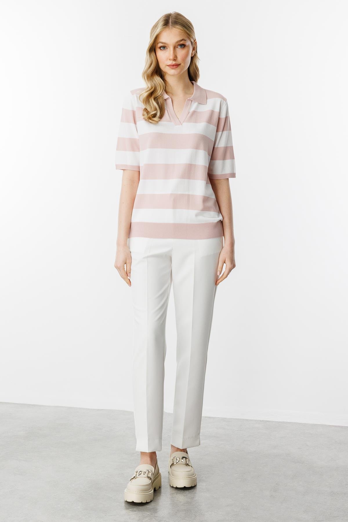 Mutlu Ertan Kadın Polo Yaka Çizgili Kısa Kol Triko Bluz Pudra - Ekru 20174