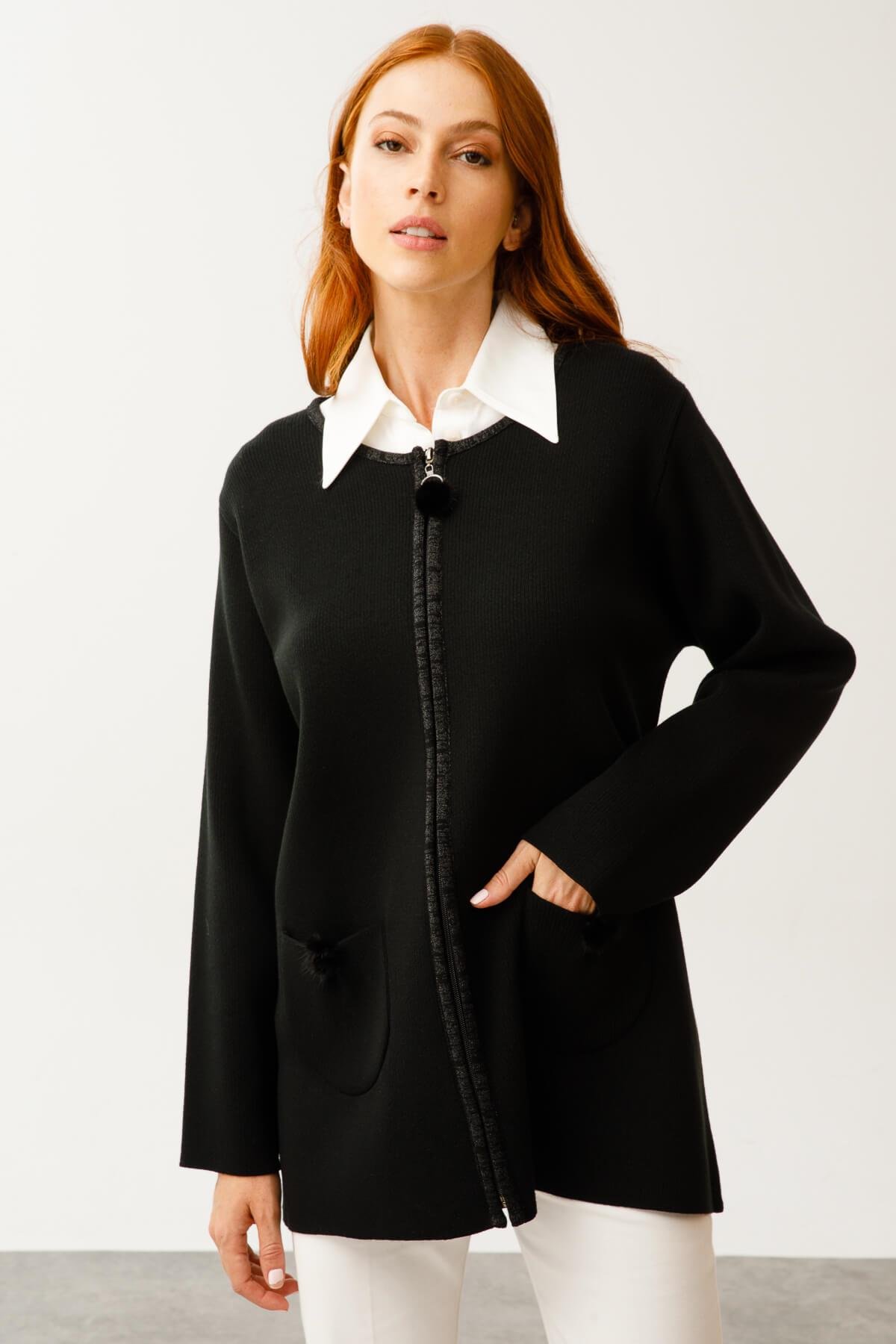 Mutlu Ertan Kadın PonPonlu Triko Cepli Fermuarlı Hırka Siyah 2982 (2982)
