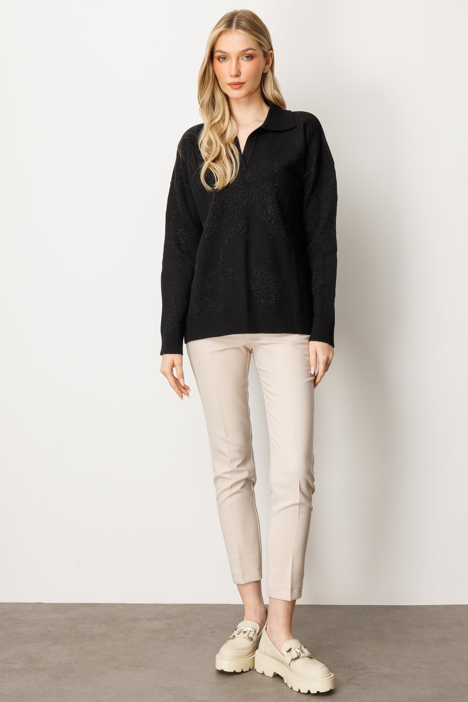 Mutlu Ertan Kadın Simli Gül Desenli Gömlek Yaka Triko Bluz Siyah-SiyahSim 20230