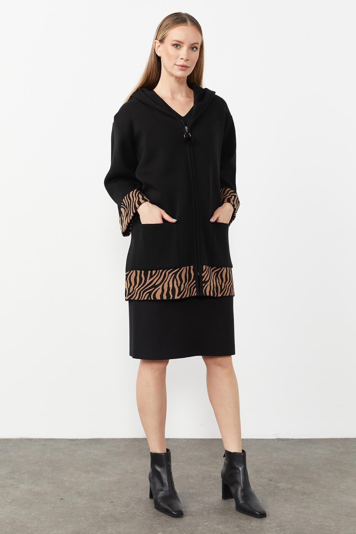 Mutlu Ertan Kadın Tıger Desen Detaylı Kapüşpnlu Triko Hırka Siyah - Camel 20050 (20050)