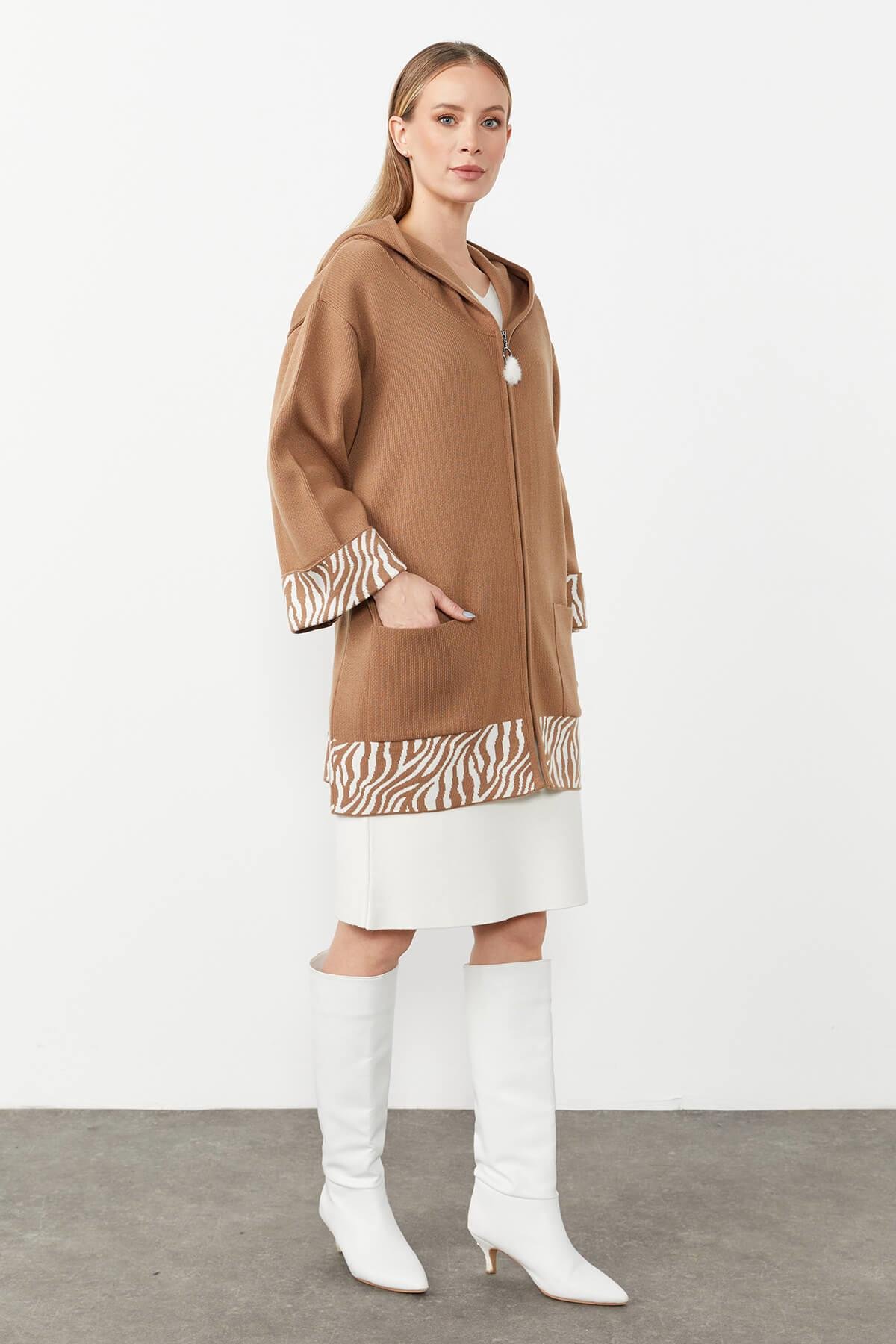 Mutlu Ertan Kadın Tıger Desen Detaylı Kapüşpnlu Triko Hırka Camel 20050 (20050)