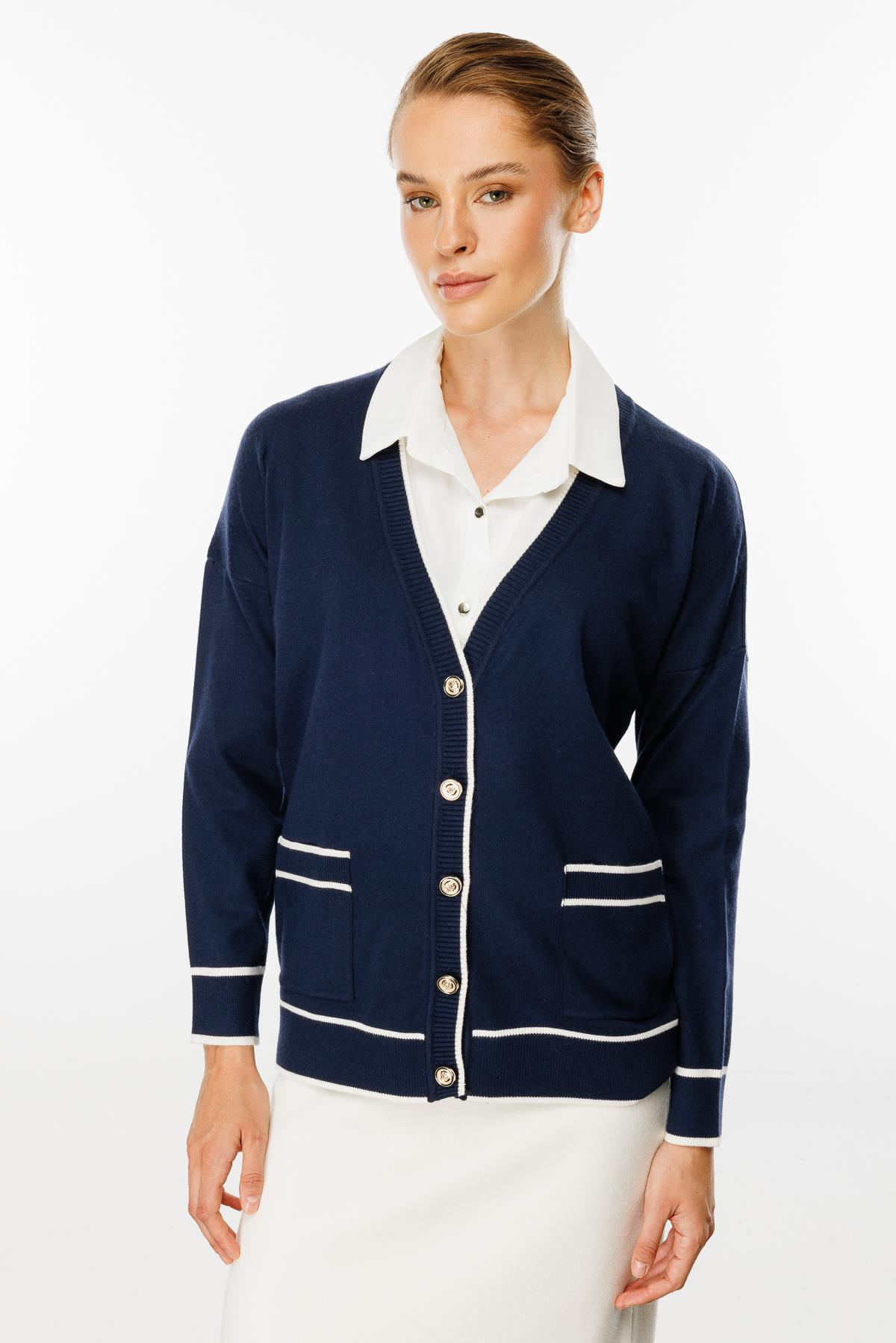 Mutlu Ertan Kadın Triko Kısa Çizgili Cepli Viskon Hırka Lacivert 20132 (20132)