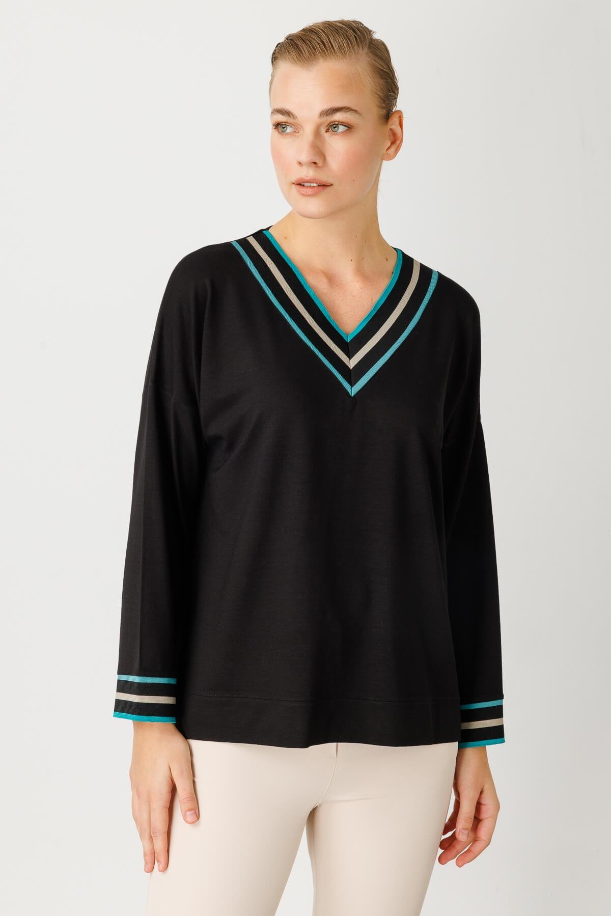 Mutlu Ertan Kadın V Yaka Ribanalı Bluz Siyah-Mint 30224 Mutlu Ertan Kadın V Yaka Ribanalı Bluz Lacivert 30224 Mutlu Ertan Kadın V Yaka Ribanalı Bluz Siyah 30224