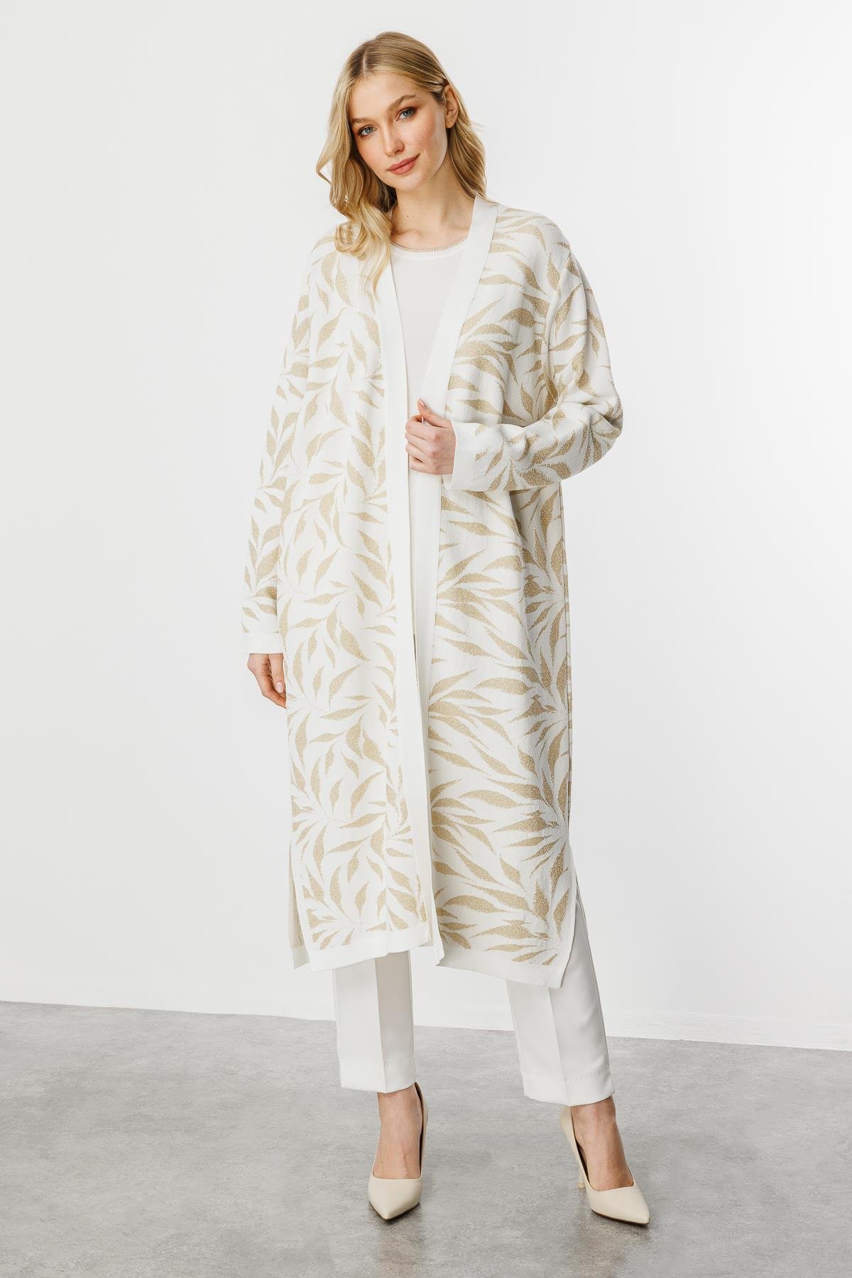 Mutlu Ertan Kadın Yaprak Desenli Simli Triko Hırka Ekru - Gold 20213 (20213)