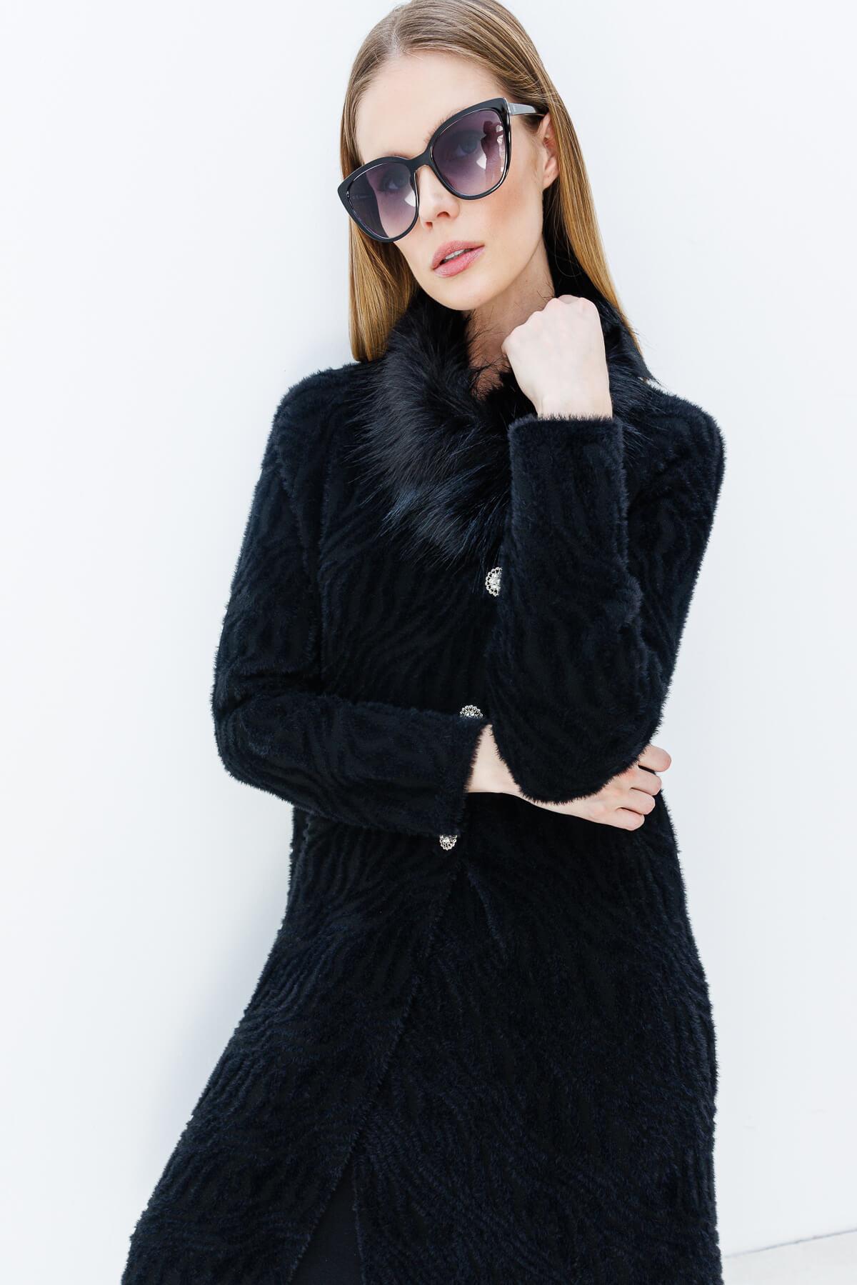 Mutlu Ertan Kadın Zebra Desenli Triko Uzun Pardesü Siyah 20035 (20035)